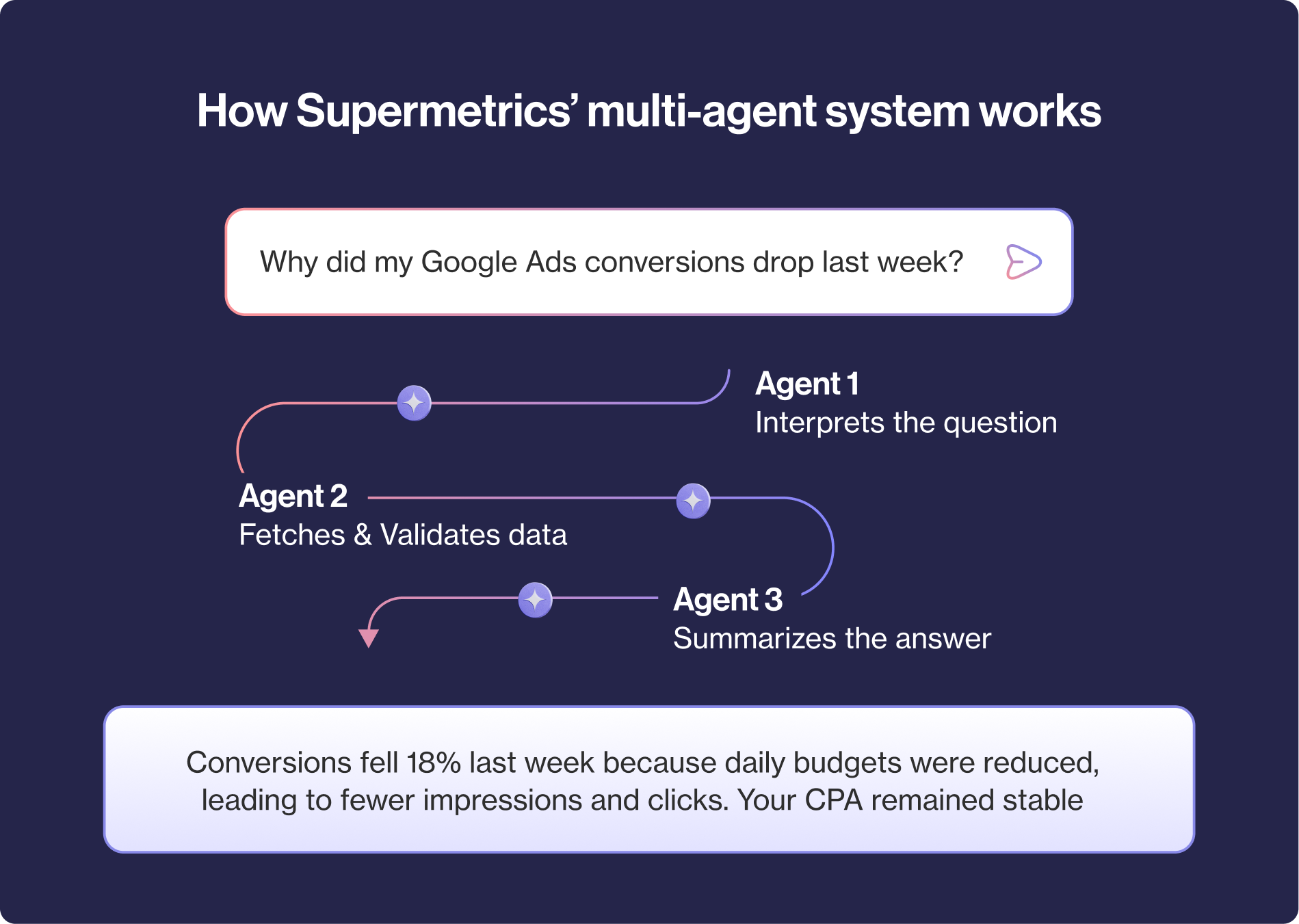 - From interpreting questions to validating data and explaining results, Supermetrics’ multi-agent system ensures accuracy and reliability at every step.