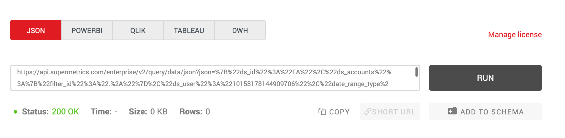 Supermetrics API comes with standardly formatted links for PowerBI, Qlik, and Tableau. JSON format links provided can be used for any other tool that supports JSON responses. If you need JSON or CSV files, you can run the query inside the query manager and export the results in single files. This can be used for various workflows, such as extracting historical files manually for combining with production data.