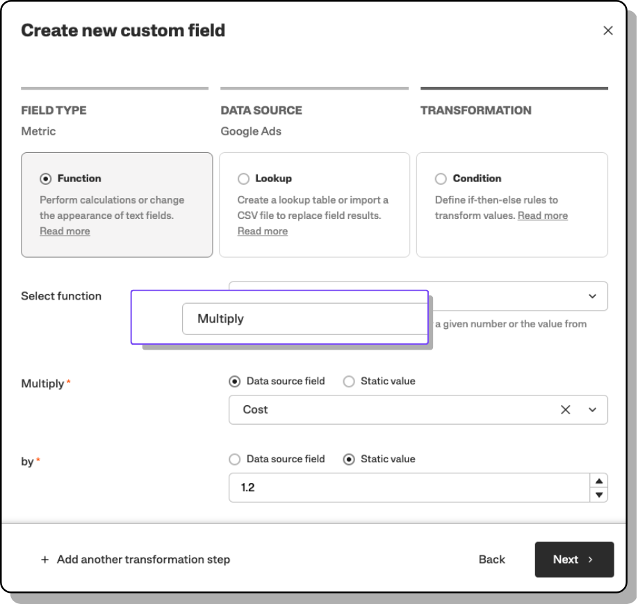 This is a popular use case among our agency marketers. Let’s say you want to calculate the agency markup to your reports to report to clients. First, you’ll select ‘Function’ as the custom field. After that, select the field cost and multiply it by your agency markup. Name the field Agency markup, and you’ll have a consistent way to report the total cost—the cost of the ads and the agency fee— for your clients.