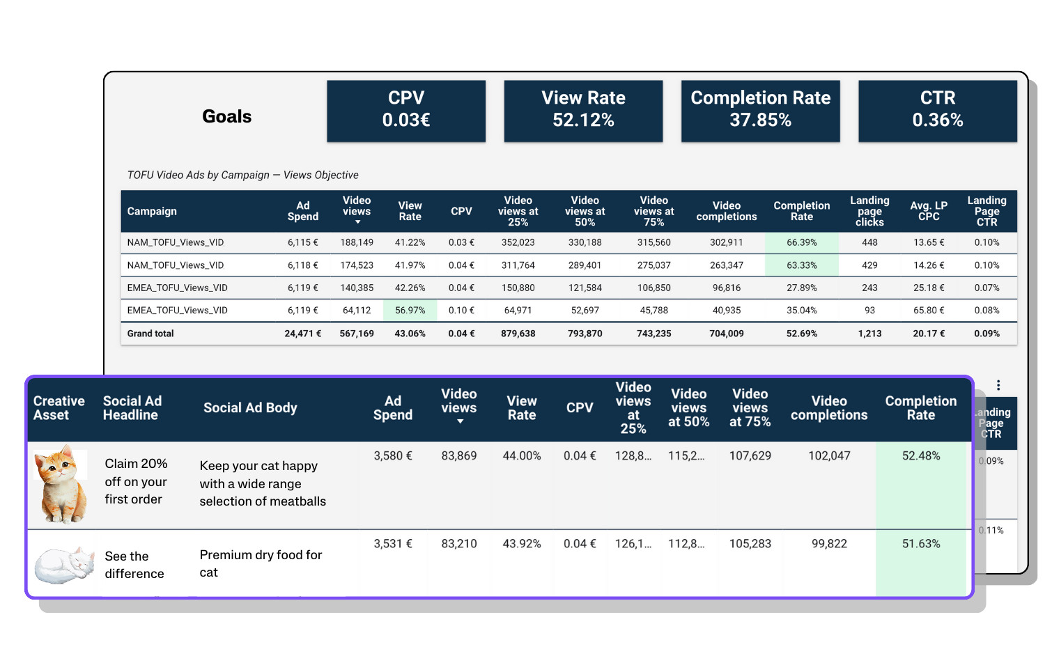 Pro tip: Different metrics show conflicting results. For example, optimizing for the cheapest cost per view (CPV) may not necessarily lead to the best completion rates or click-through rates (CTR). That’s why you need to define campaign goals and choose the appropriate metrics to optimize.