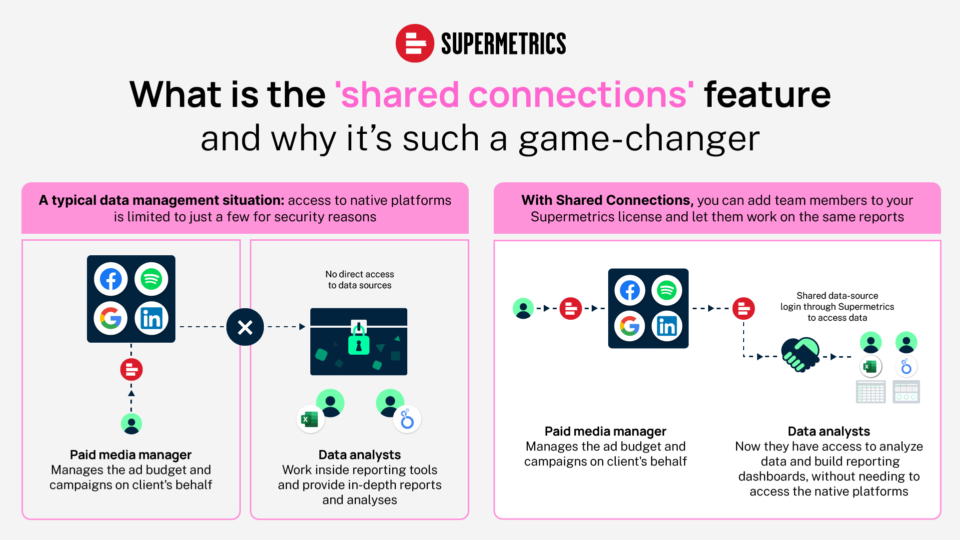 Shared connections allow you to connect to a data source once and make that connection accessible to anyone on your team who needs access. This means that team members won’t have to log in to marketing platforms using their own credentials, improving their efficiency and collaboration.