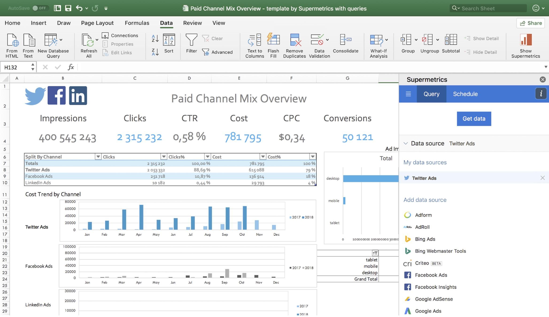 For example, you want to create a stunning PPC marketing report in Excel. Without Supermetrics you would have to manually copy paste the data or download tens of CSVs from each platform and pull those files together. This task is tedious, boring and unproductive, but even more importantly it is prone to human error: one small mistake and your whole report will not be correct.