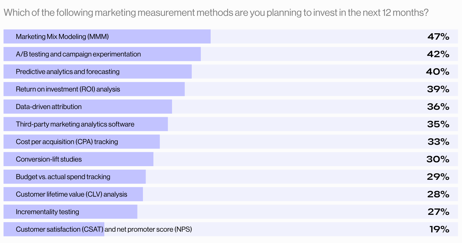 45% of CMOs say they can’t measure the impact of marketing . We’re seeing many teams are still relying solely on last-click attribution despite the loss of tracking signal with the (slow) death of 3rd party cookies. On the other hand, advanced approaches such as marketing mix modelling , multi-touch attribution, and incrementality testing are gaining traction but are not democratized for most businesses. Marketing Intelligence platforms should give both campaign reporting and dashboarding, as well as advanced marketing measurement capabilities, so that businesses can leverage them without paying for expensive teams of data scientists or consultants.