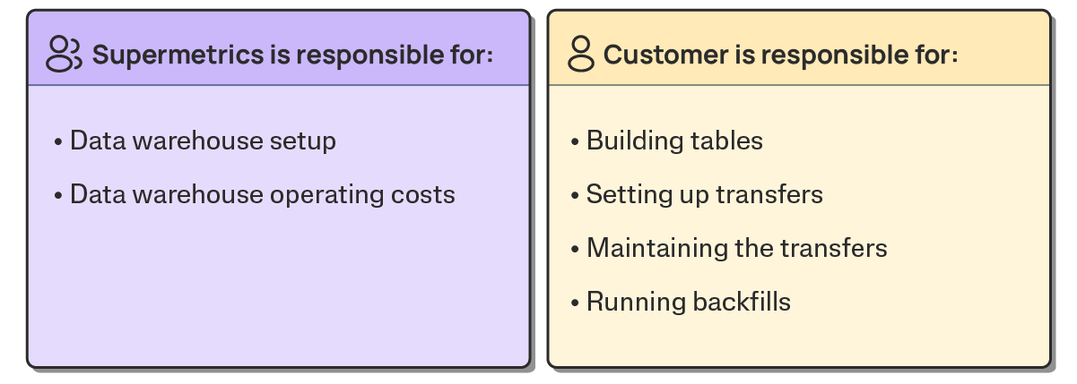 On the other hand, teams that have data engineering resources may be better off owning a marketing data warehouse and using Supermetrics to pipe and transform the data . This gives you full control and freedom over managing your data. If you already have a data warehouse solution in place, we recommend that you continue with that if you have the required resources to maintain it and make use of its advanced capabilities. Supermetrics integrates with all common marketing data warehouse solutions .