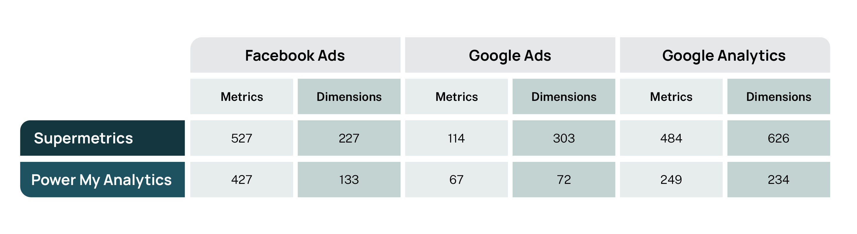 Power My Analytics pulls in fewer data points than Supermetrics. To compare the amount of data available, let’s take three of the most popular data sources and see what you can get with Supermetrics and Power My Analytics respectively.