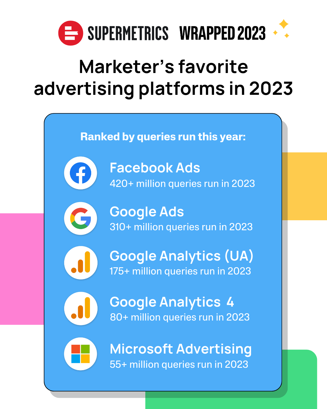 The next generation of Google Analytics made it to the top 5 list with over 80 million queries run with the GA4 connector . Marketers are getting familiar with GA4. Since the reporting interface of GA4 is quite limited , with only a few predefined reports, many marketers prefer to pull GA4 data into their own reporting tools, where they have more freedom to build the exact reports they need.