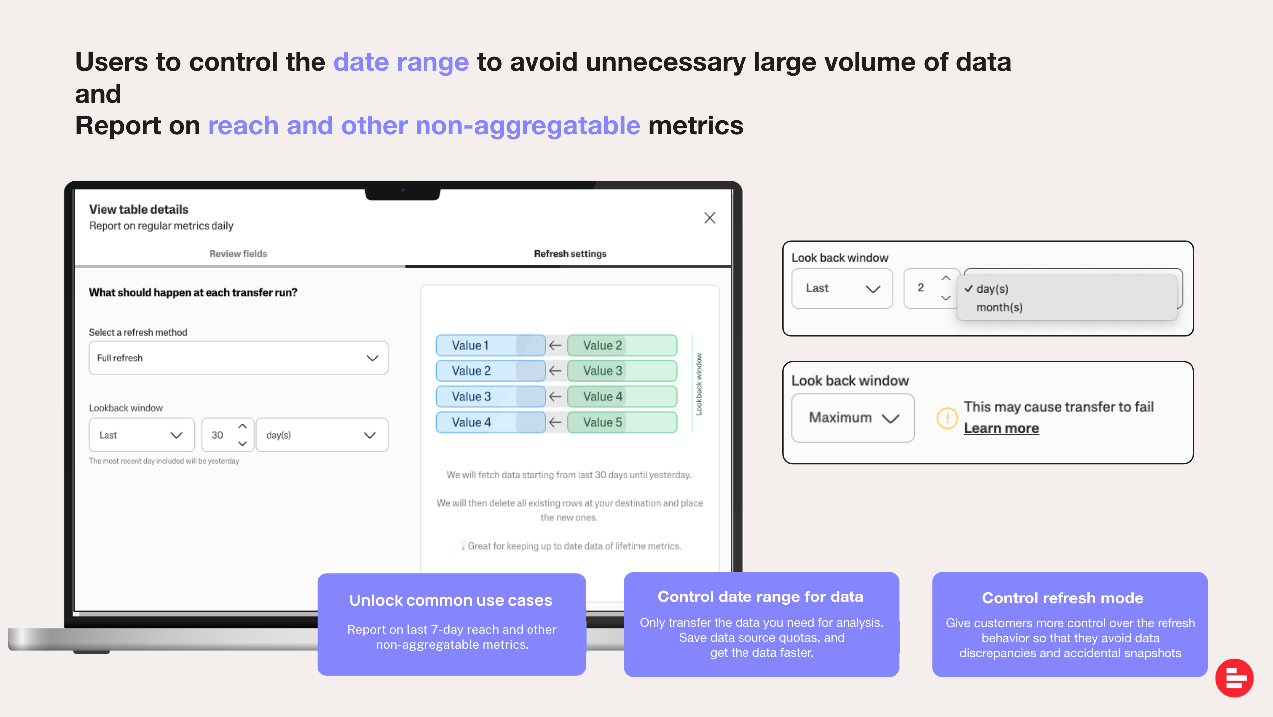 We also made some key updates to our data warehouse offering over the course of the year. One of the most impactful is the new refresh settings for data transfers, giving you more control over how often your data is updated. You can now choose from three refresh modes and a customizable lookback window to fine-tune your data transfers.