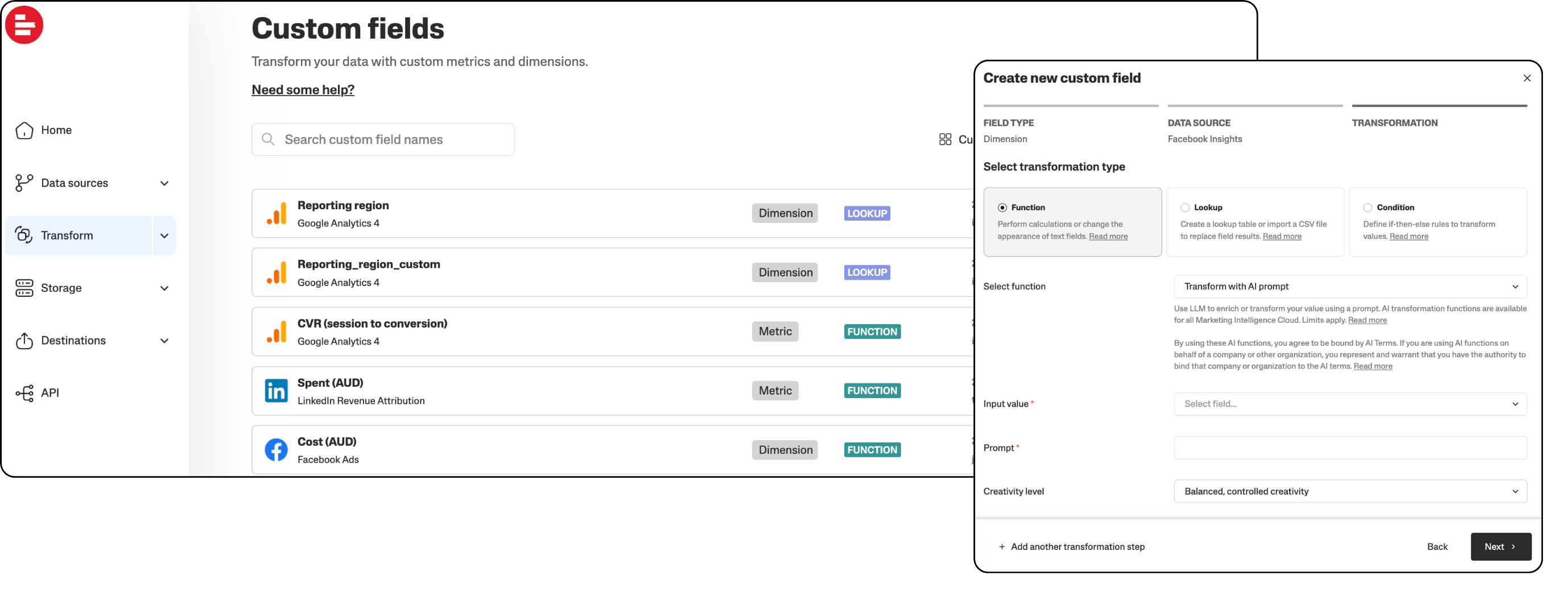 AI custom fields : Using AI-powered custom fields, you can prompt your way to data transformation. It can help with tasks like cleaning up campaign names, enriching data with public data, and validating your data against guidelines. It's like having a data expert by your side.