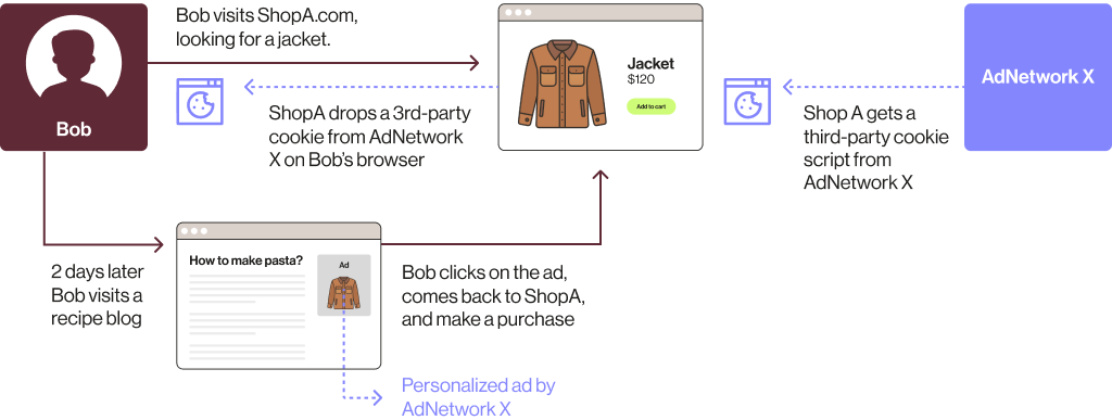 Imagine you visit ShopA.com to browse for a winter jacket. ShopA.com has a script in its website code linked to AdNetworkX. This script drops a third-party cookie from the ad network into your browser, capturing your interest in winter jackets.