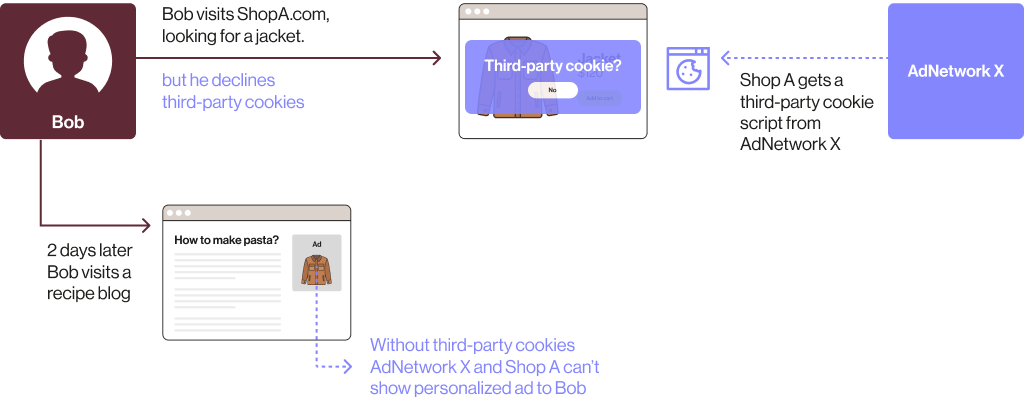 Flow chart showing how third party cookies can't track user visits and personalize ads if users block third-party cookies or disable third-party cookies