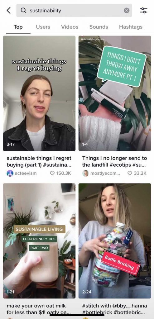 Alternatively, you can also find influencers by using relevant hashtags on TikTok. Let’s say your brand sells vegan bags. You can search for #sustainability, #sustainableliving, or #ecofriendly. You’ll see the most popular video within that category.