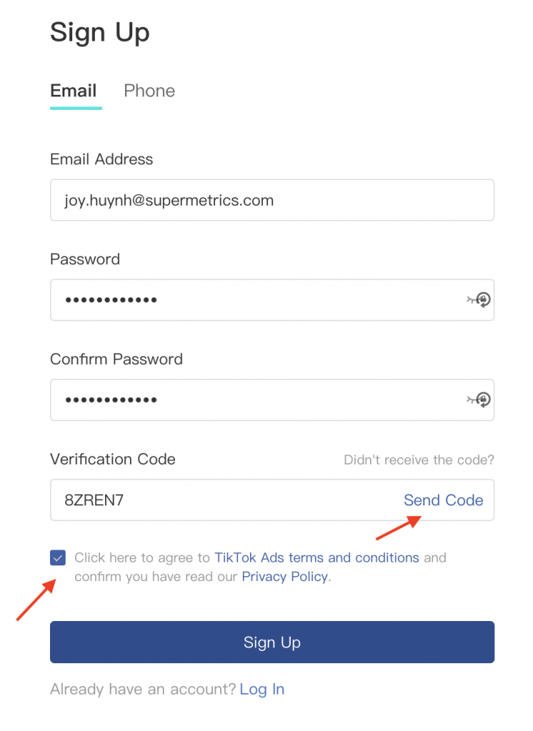 On the TikTok for Business page, you should fill in your email address and choose your password. Then, you need to click ‘Send code.’ After that, you’ll find the verification code in your email. Next, agree to TikTok terms and conditions.