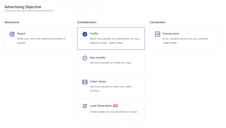 To begin, you need to choose your campaign objective. There are five objectives that you can choose from: