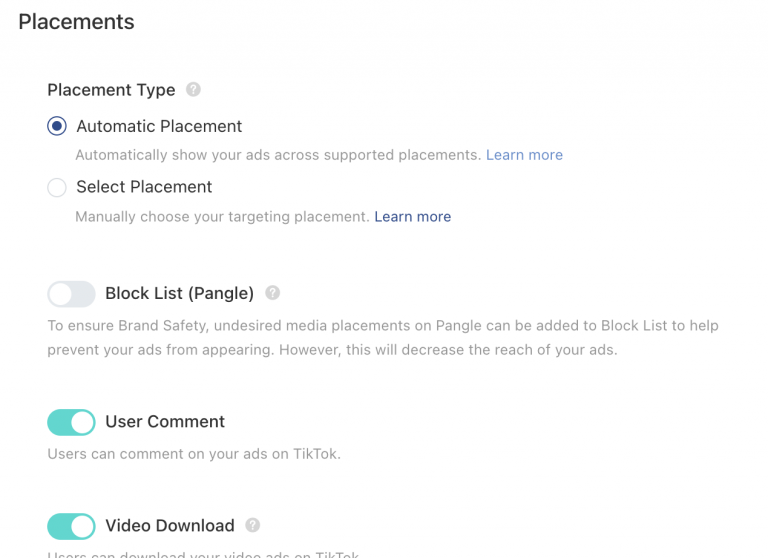 Here, you can choose where you want your ads to appear on TikTok. You can manually select your ad placement or choose automatic placement. TikTok will automatically show your ads across all TikTok partner apps, including TikTok, News Feed App Series, and Pangle.