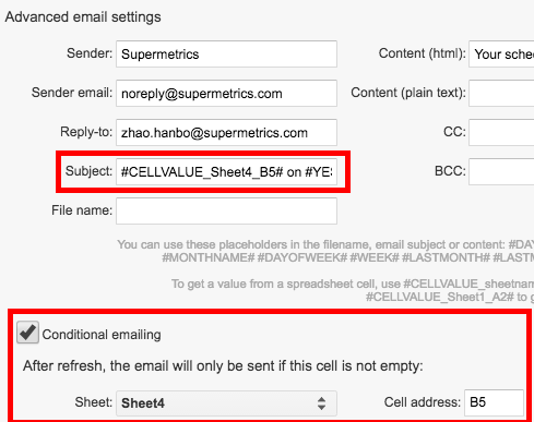 You can also customize the message for your subject, email content or the file name. Here I chose to include the cell value and the date of yesterday in the subject so I don’t even to open this email to see the actual alert. You can use the same method to set up cost alerts for multiple accounts in the same network.