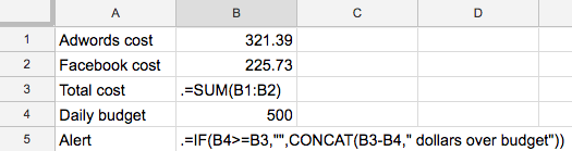 First, create two queries to pull your Adwords and Facebook cost data for yesterday. Then sum them up and put your total daily budget into a separate cell. After that, use an IF formula to create the trigger for your alert. Leave the alert cell empty if the cost doesn’t exceed the budget.