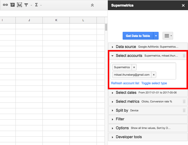 It’s rather easy to pull data from multiple accounts with Supermetrics. When you select accounts, you simply add all the accounts you want to report on. And there are no limits on the number of accounts you can select for one query.