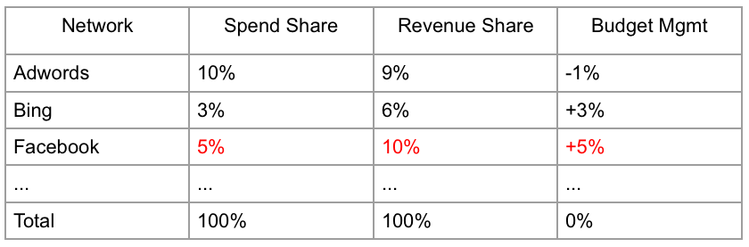 In this example, you can see Facebook takes 5% of the ad spend but contributes 10% of the revenues while Adwords has a smaller revenue share than its spend share. So if you have a budget cap, it probably makes sense to move some budget from Adwords to Facebook. Or if there is no strict budget limit as long as your can ensure a positive ROI, you may always want to prioritize networks and campaigns with positive revenue shares.