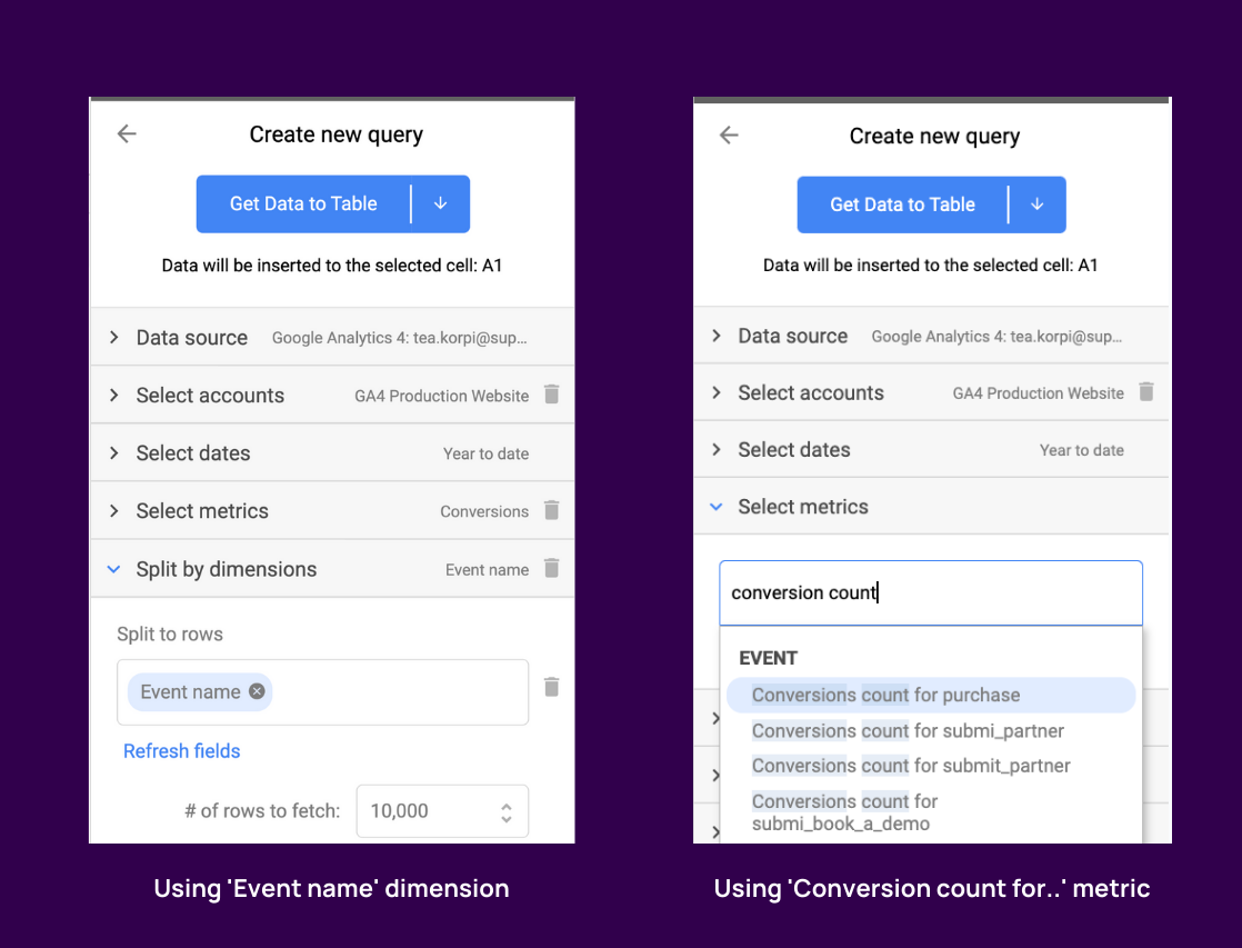 Since GA4 uses event-based tracking, it’ll change how you track your goals and transactions. For an event that you marked as conversion in GA4, in Supermetrics, you can find the conversion event as a custom field using the dimension’ Event name’ or the metric ‘Conversion count for…’