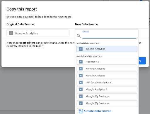 Another option is to copy your existing dashboard, which uses Universal Analytics, and replace the data source with Google Analytics 4. This way, you don’t have to create a report from scratch. However, we recommend you check the fields to make sure they match.
