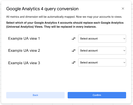 Step 3: Map your UA views to your GA4 Properties. You can map all views to one property or even skip views.