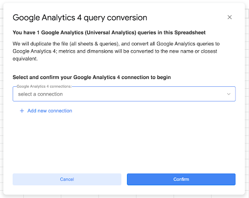 One option is to try our Google Sheets Query Migration tool, which duplicates your spreadsheet and converts all UA queries to GA4 using direct or closest equivalent fields. Please note that you shouldn’t expect 1:1 reports since the data structures between the connectors and platforms differ.