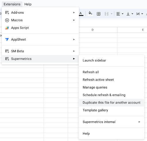 - File duplication flow: Go to ‘Extensions’> ‘Supermetrics’> ‘Duplicate file for another account’. You can select another account to link your query in the duplication flow.