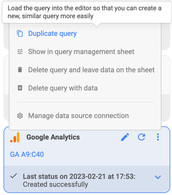 Another option is duplicating your existing query by selecting the action from the Supermetrics sidebar and replacing the data source with Google Analytics 4.