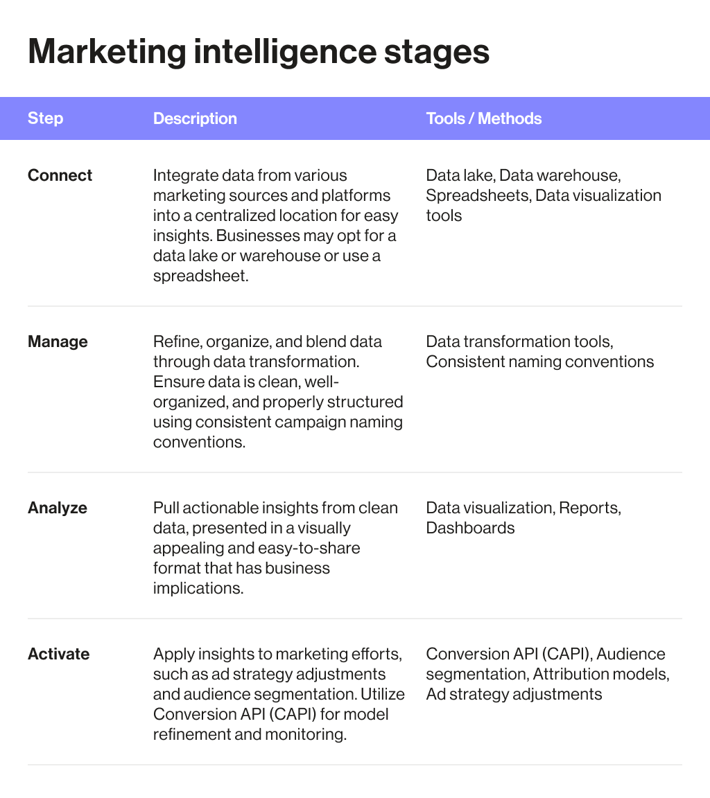 4. Activate: in the activate stage, you’re applying insights to marketing efforts. A good example of this is ad strategy adjustments. After learning about certain behavior cues, you can use a Conversion API (CAPI) to build a new audience segmentation or attribution model. This helps you further monitor and refine your efforts.
