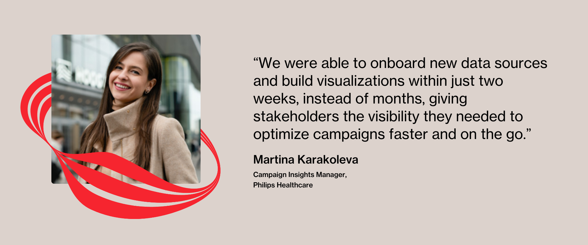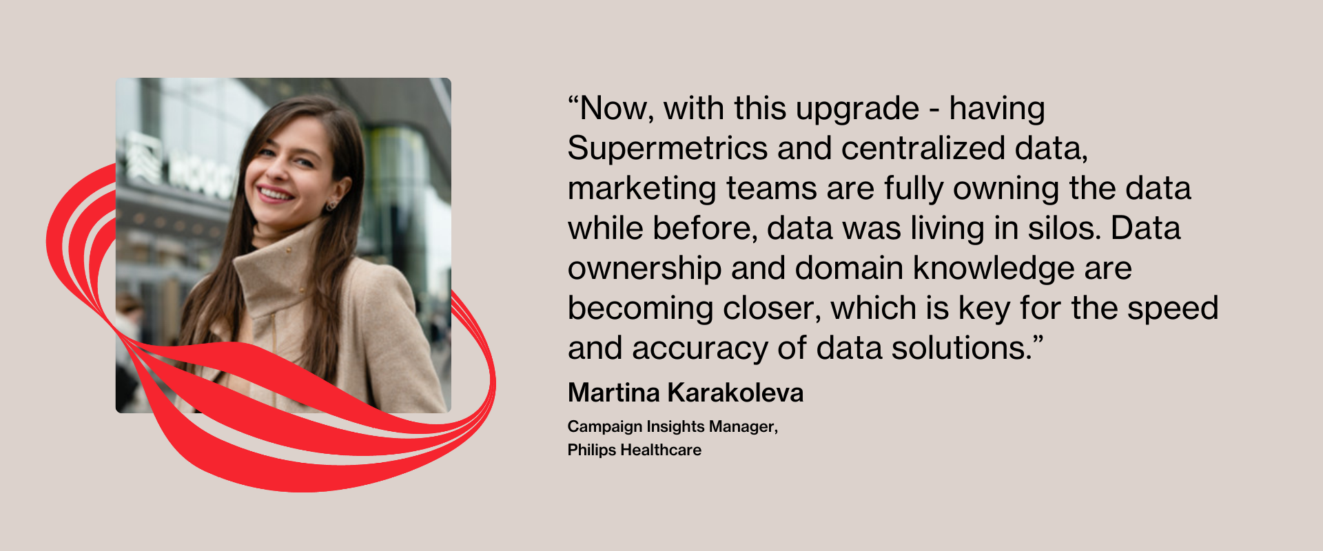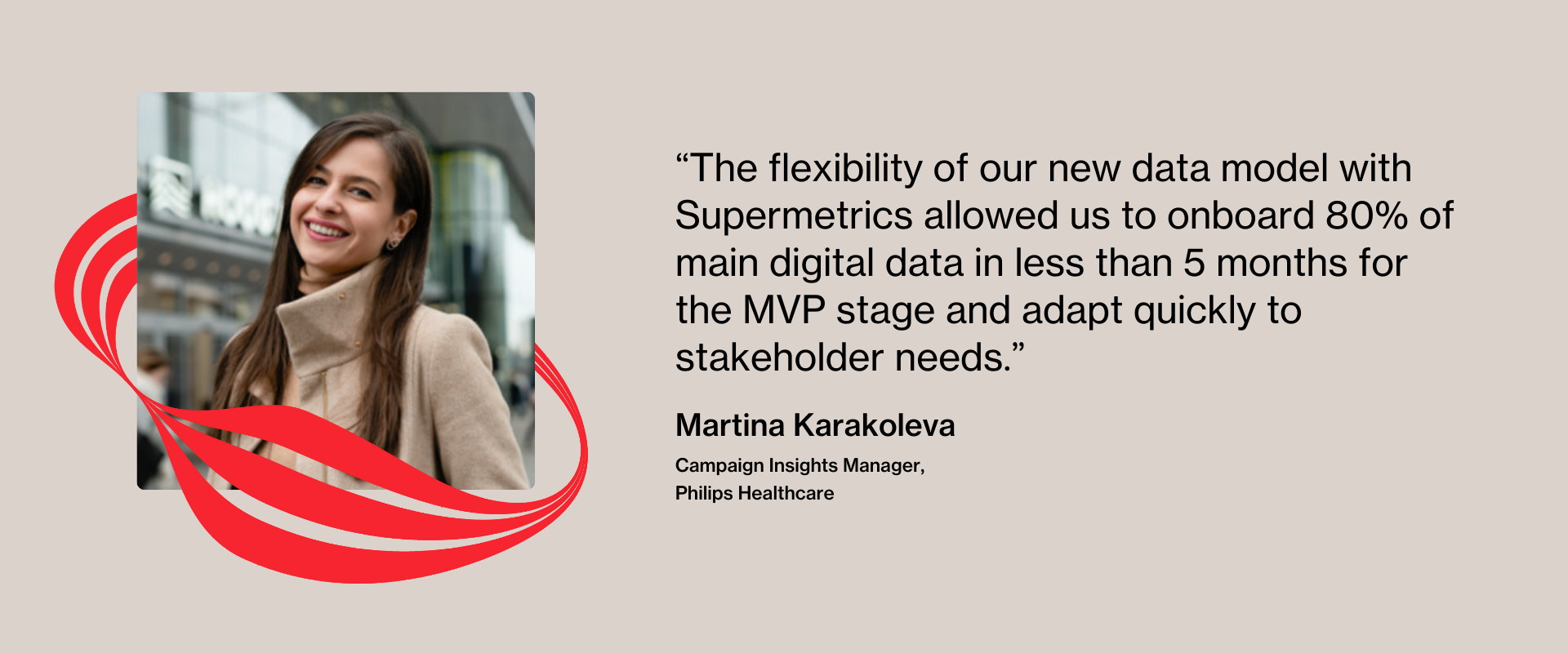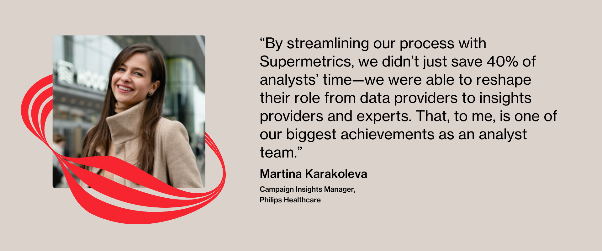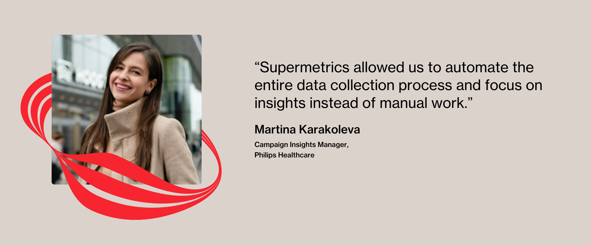 Led by Martina Karakoleva, Campaign Insights Manager at Philips Healthcare, the team built an automated, scalable digital data infrastructure in just six months with the help of Supermetrics. They saved time, improved the speed of insights, and created one source of truth for digital data for stakeholders globally.