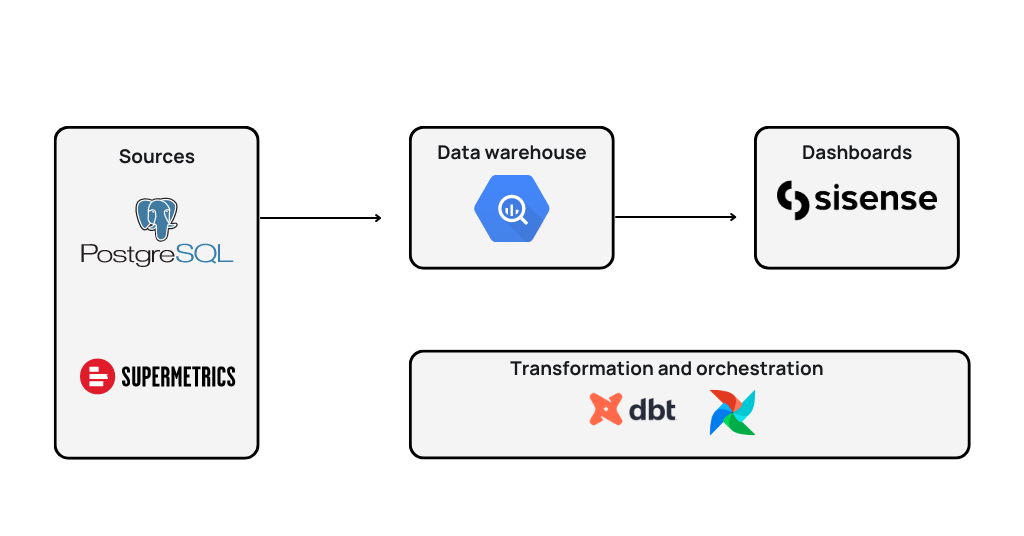 - As the team grew, they used Supermetrics to feed data into BigQuery, where they organized and transformed their data before reporting and analytics.