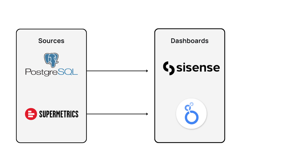 At the beginning of their data journey, the Aiven team brought data straight from sources to their BI tools. For marketing data, they use Supermetrics to get data into Looker Studio, where they build dashboards. For internal data, like product data, they fed data directly from their backend in PostgreSQL to Sisense, where they did some simple data modeling before visualizing the data.