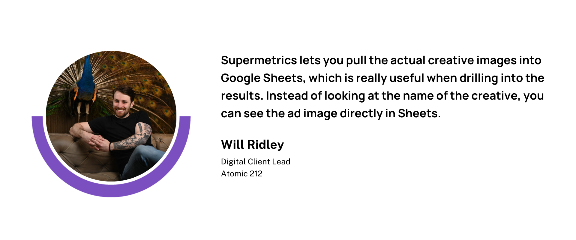 Atomic 212 also leverages Supermetrics for automated creative reporting. The team is always up to date on what creatives are performing well and most importantly why. This is especially useful when they're running many creative A/B tests and want to quickly aggregate insights from them.