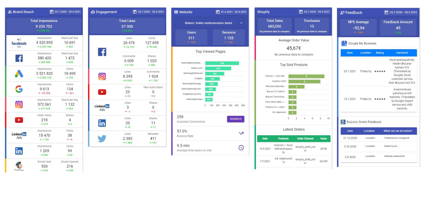 BisLenz is a customer experience suite that pulls marketing, web analytics, and ecommerce data into visual dashboards. Powered by Supermetrics API, the software gives decision-makers a centralized platform for improving their customer experience.