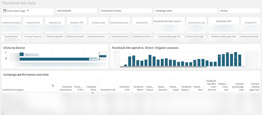 The next page focuses on Facebook Ads performance. From here, Robert and his team can find the scorecards representing the key Facebook Ads metrics and a table with a campaign performance breakdown.