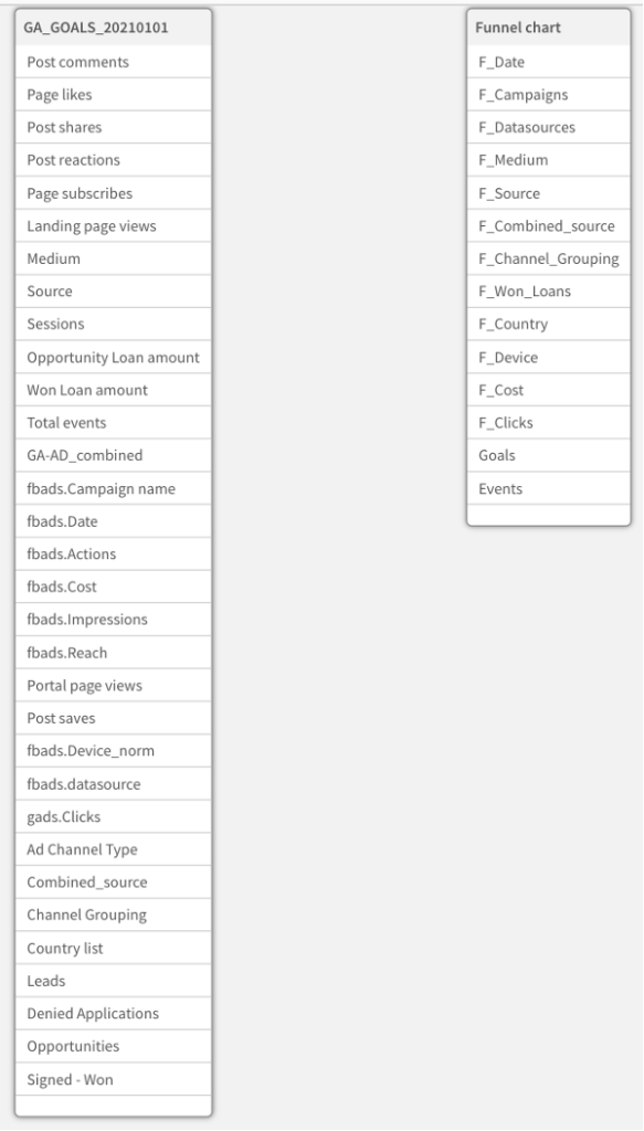 In the resulting table, the ‘Goal’ column had all the goal completion values as dimensions. This is used mainly for the report sheet — which shows the conversion rates and cost breakdown by funnel stage. The unpivot was achieved using the ‘CrossTable’ function in Qlik.