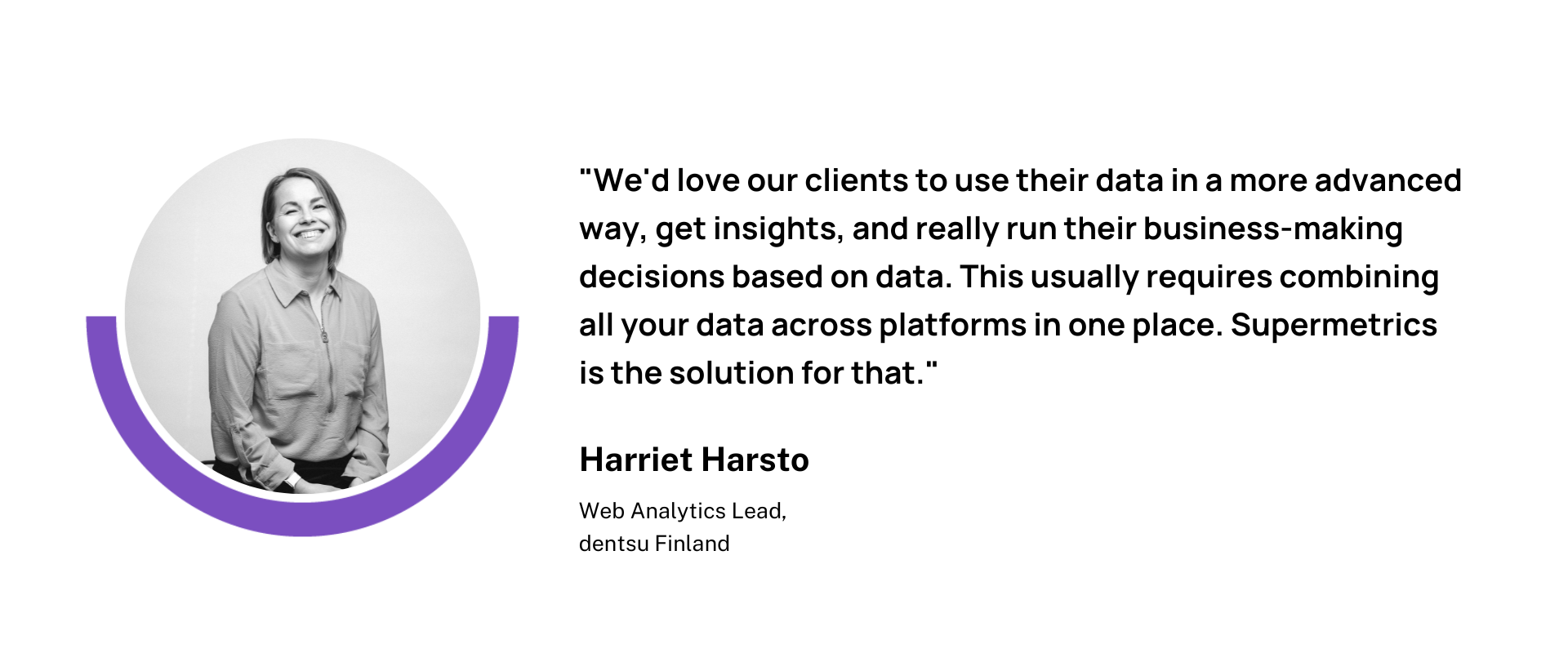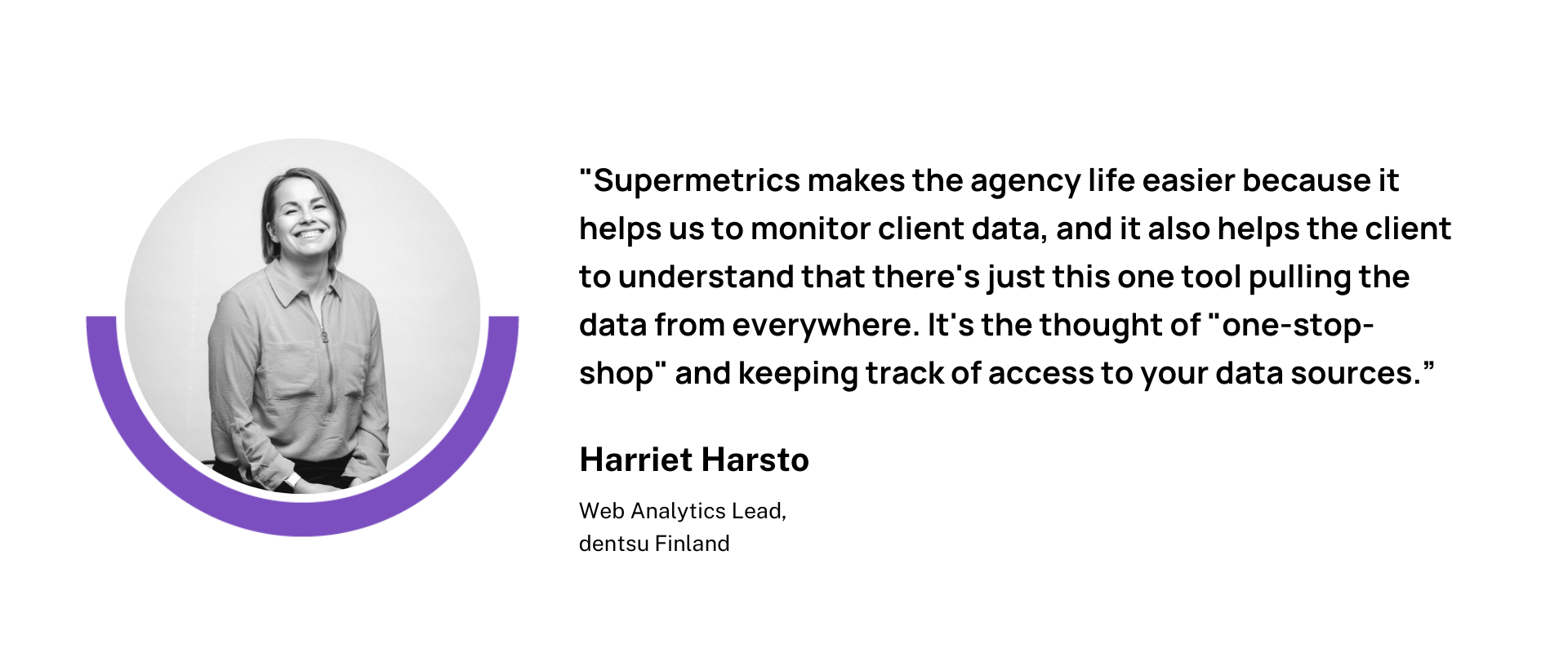 Harriet says, “Supermetrics is a great tool for combining all data sources. Our clients want to understand how they perform in different channels. With Supermetrics, we have a solution for them. We can help them with our license, or if they're more data-mature and have their own license, they can do that. It's quite simple, either way."