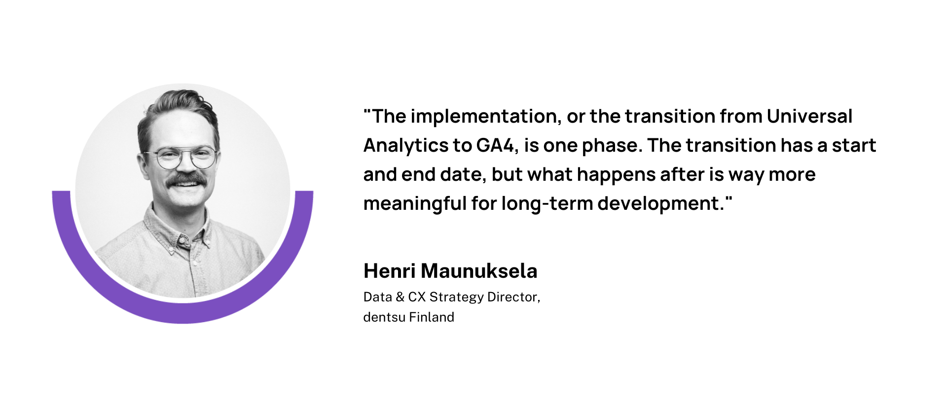 During the past few years, dentsu Finland has helped numerous clients make a smooth transition from Universal Analytics (UA) to Google Analytics 4 (GA4). After countless discussions around the topic, the team at dentsu noticed that most conversions that started from the need to switch to GA4 actually led to much wider discussions about rethinking the client's entire data collection strategy.