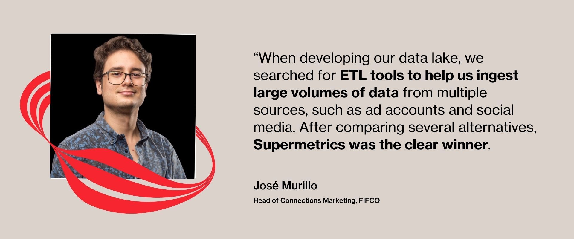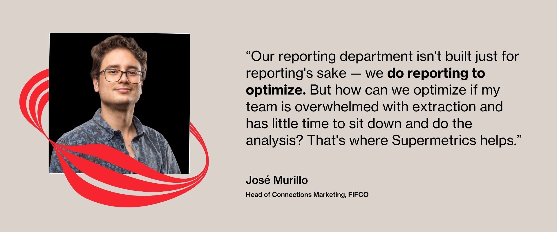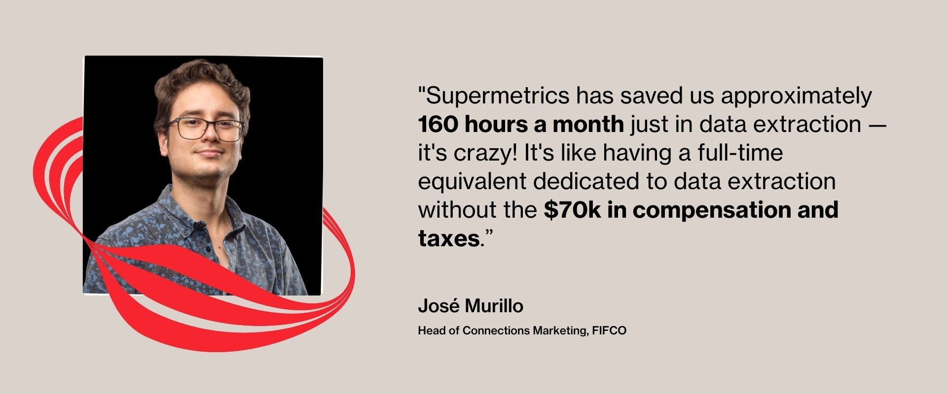 We caught up with FIFCO's Head of Connections Marketing, José Murillo, who shared how their award-winning in-house agency uses Supermetrics for data ingestion, automating reports, and building predictive models. This has saved FIFCO 160 hours a month on ingesting data and $70k in compensation and taxes.
