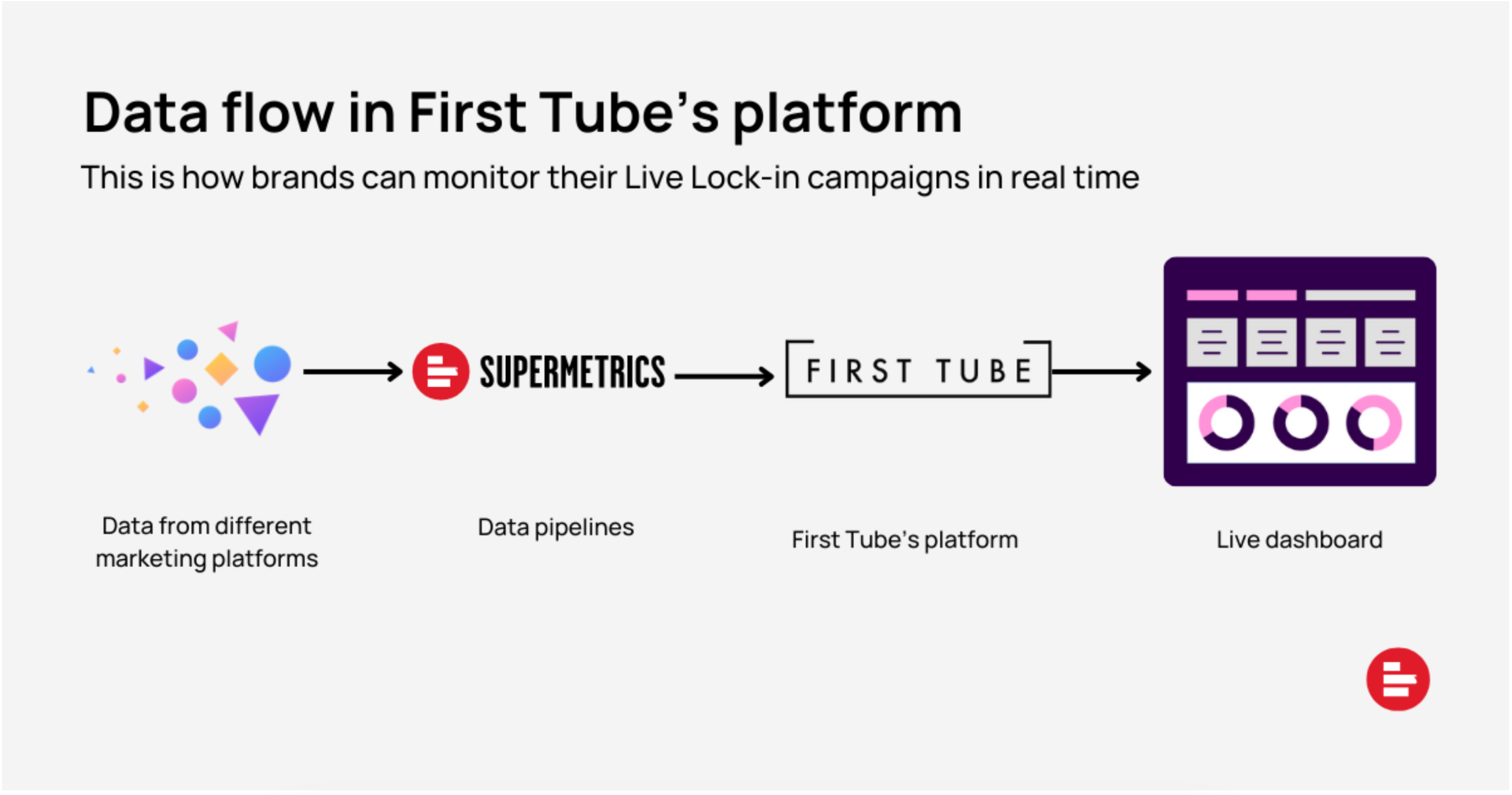And that's where Supermetrics API comes in. Using data from different media sources, First Tube can push everything through the Supermetrics API into real-time data dashboards, allowing clients to see the performance of their Live Look-in campaigns.