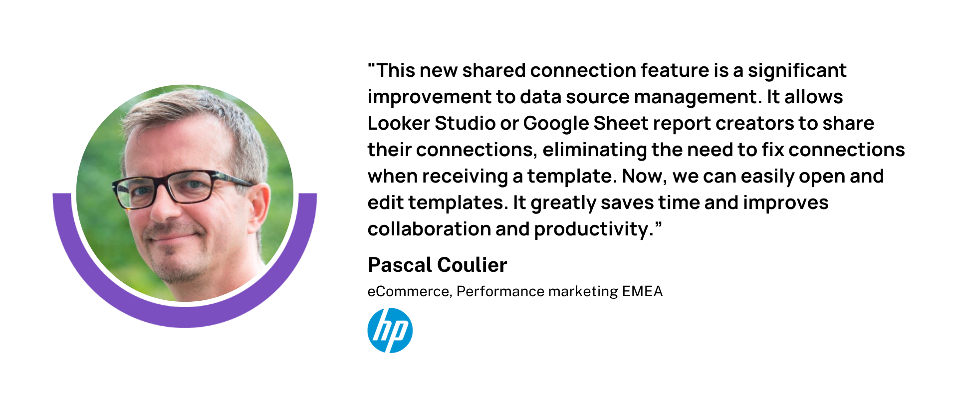Pascal says, “Previously, sharing Looker Studio dashboards required redoing connections with individual accounts, causing frustration and wasted time. With shared connections, team members can easily share their connections, eliminating the need to fix broken links when receiving templates. It’s made data available to everyone and the process of managing access is so much easier than with our old setup.”