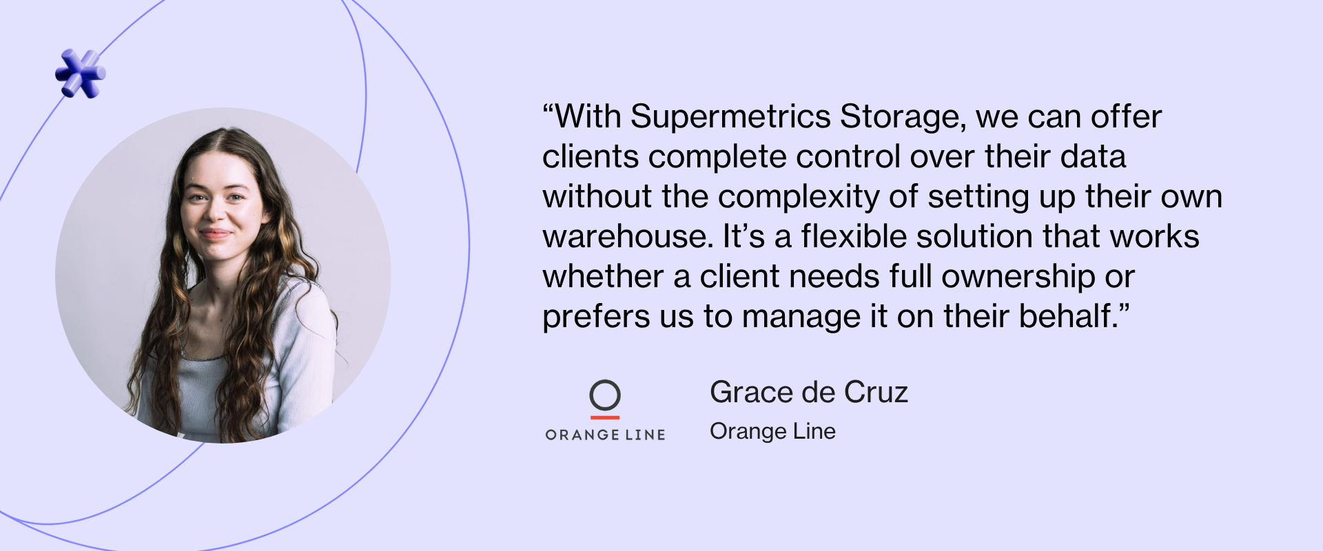 - Supermetrics enables Orange Line to deliver fully tailored solutions for storing marketing data, from fully managed Supermetrics Storage to client-owned data warehouses, depending on clients' preferences.