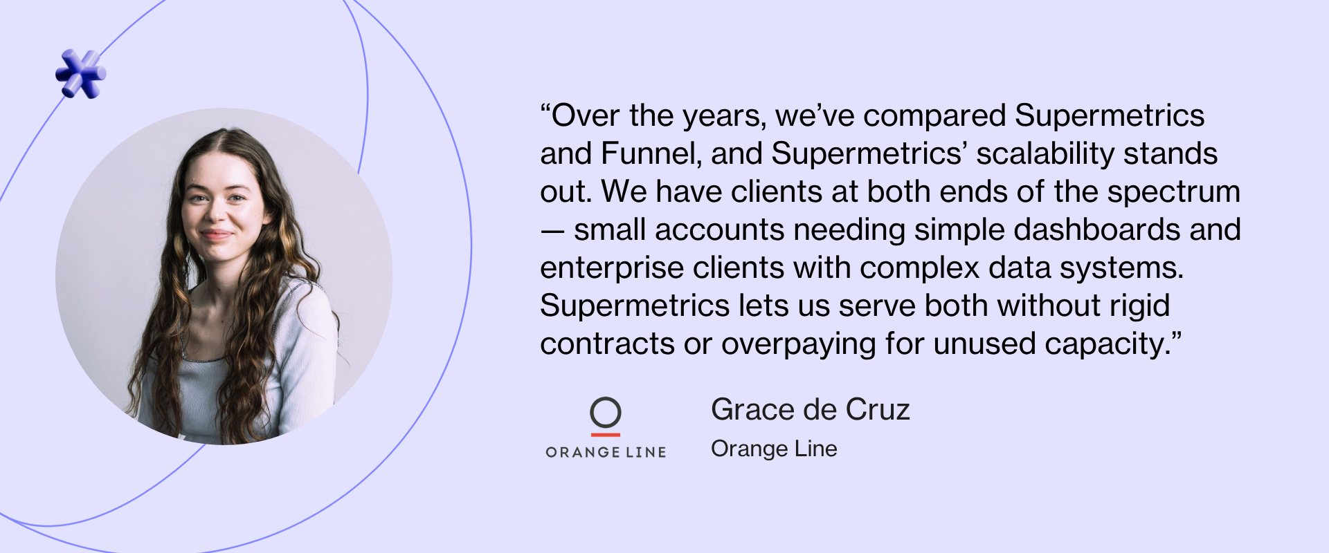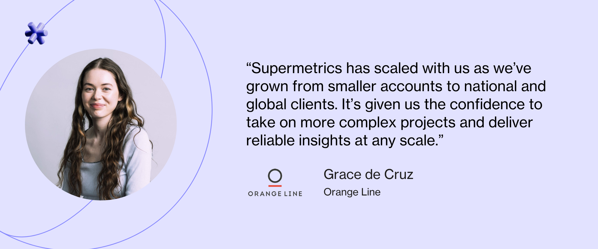 - The Supermetrics Marketing Intelligence Platform has become the backbone of Orange Line’s data architecture, allowing the agency to serve increasingly complex clients and manage sophisticated reporting at scale.