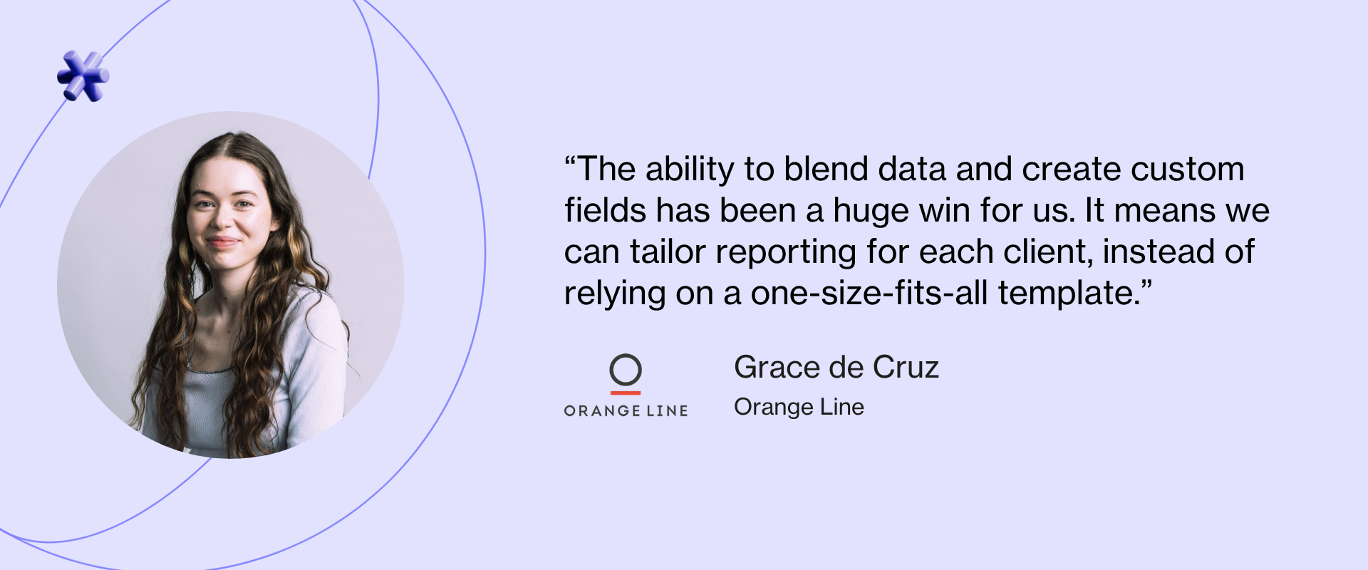 Data blending and custom fields are core features that make reporting at Orange Line powerful and flexible. Custom fields help the team fix gaps in naming conventions, convert currencies, and standardize metrics across platforms.