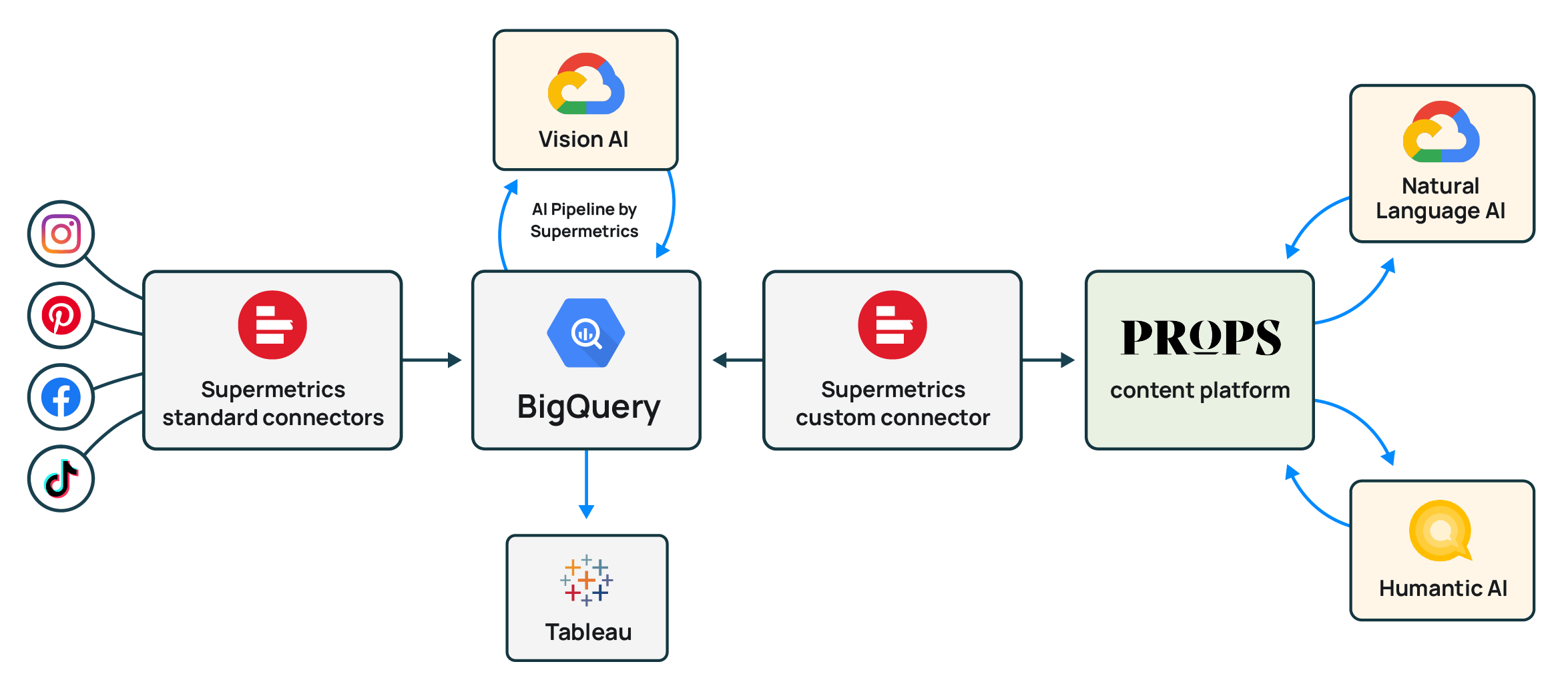 - The Professional Services team created a custom solution to connect the Props content marketing platform and the AI software to BigQuery.