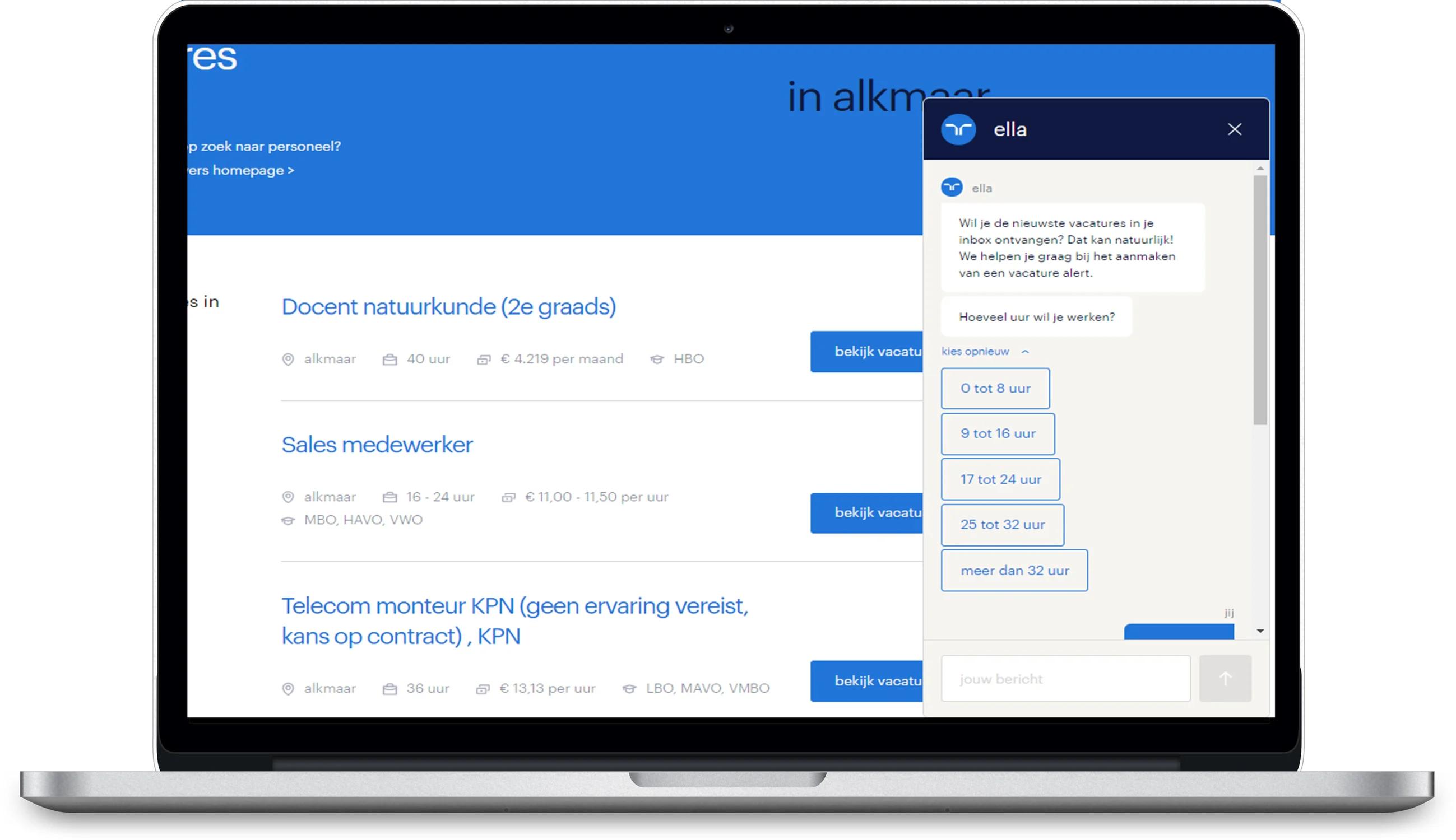 Then Cynthia asked the chatbot’s content manager to create a dialogue in the chatbot tool in the tone of voice of Randstad. Based on insights from previous A/B tests on the website, the team knew that visitors would be more willing to engage with Ella when the tool included an interactive element. With this in mind, they added the first question of creating a job alert directly to the chatbot dialogue, and only after that, they showed the link to the job alert page.