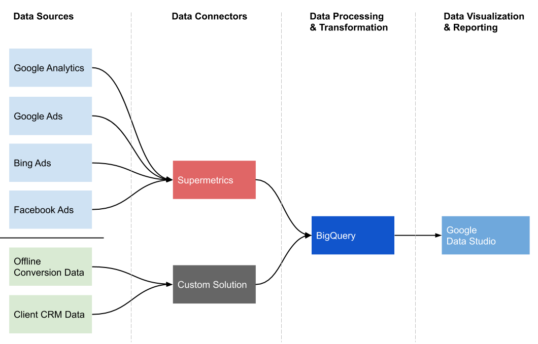 For Siavak’s needs, BigQuery was a perfect solution. But one challenge still facing Ahmad was how to pull in data from all the sources he needed? Siavak’s clients at that time were not using the Google 360 Suite, which would natively connect to BigQuery. And even if they were using Google Analytics 360, that would have only solved part of the analytics data puzzle. Ahmad still needed a solution which could get data from non-Google platforms into BigQuery in the required format.