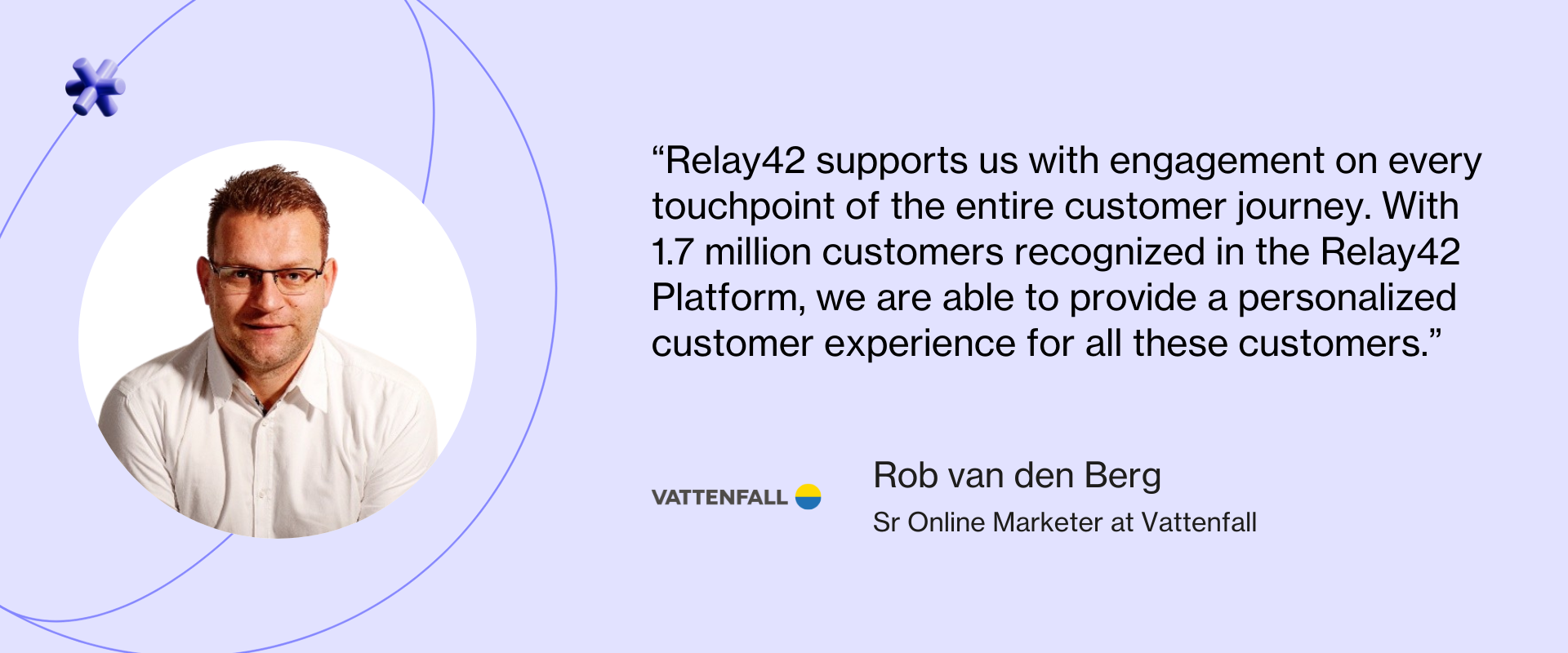 Vattenfall is one of Europe's leading energy providers. In the world of utilities, where customer retention is key, Vattenfall aims to transform every aspect of its business to be fully customer-centric. Vattenfall chose Relay42, now part of Supermetrics, to implement intelligent personalization across all its marketing channels by orchestrating individual customer journeys for approximately 2 million customers in real-time.