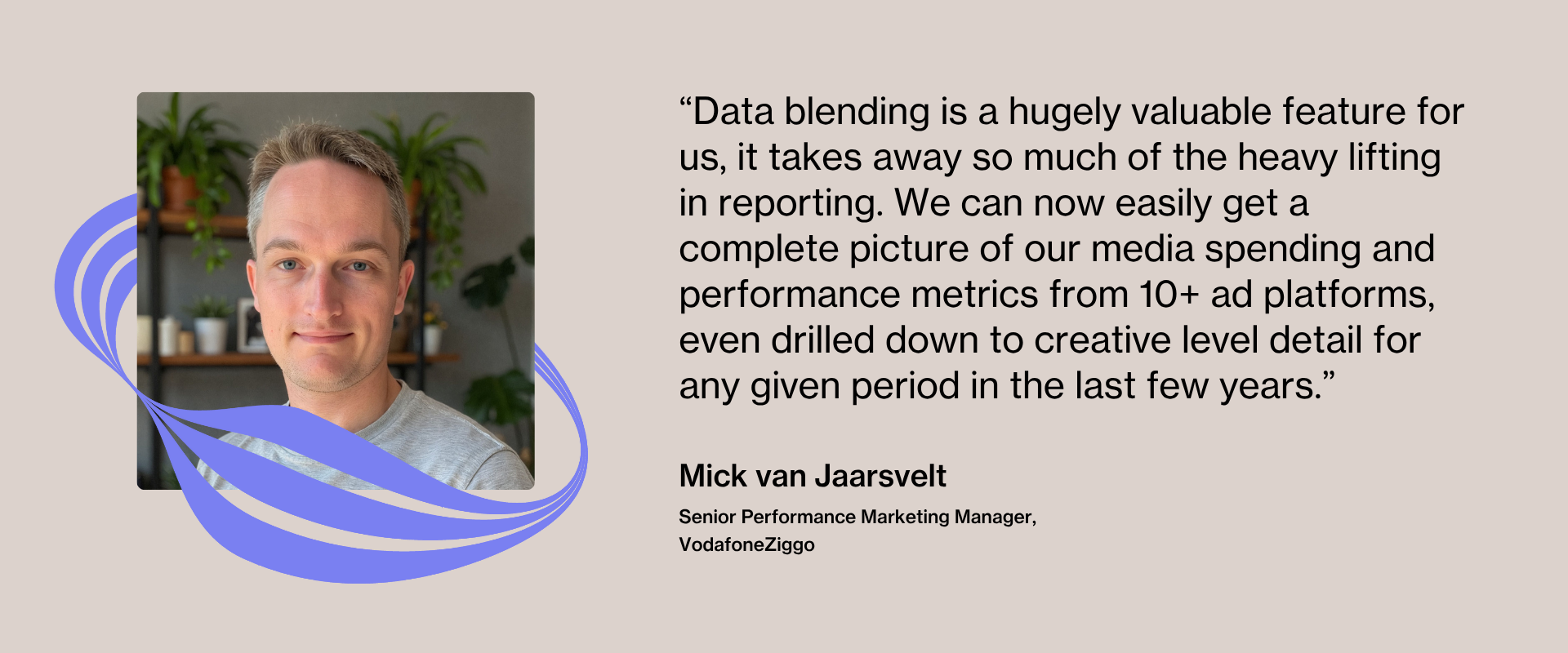 The data blending feature automatically standardizes and maps fields across channels, no matter if it’s “cost”, “spend” or “total spent” you’re comparing. VodafoneZiggo uses the data blending feature to blend data across paid channels to get a unified view of marketing performance.