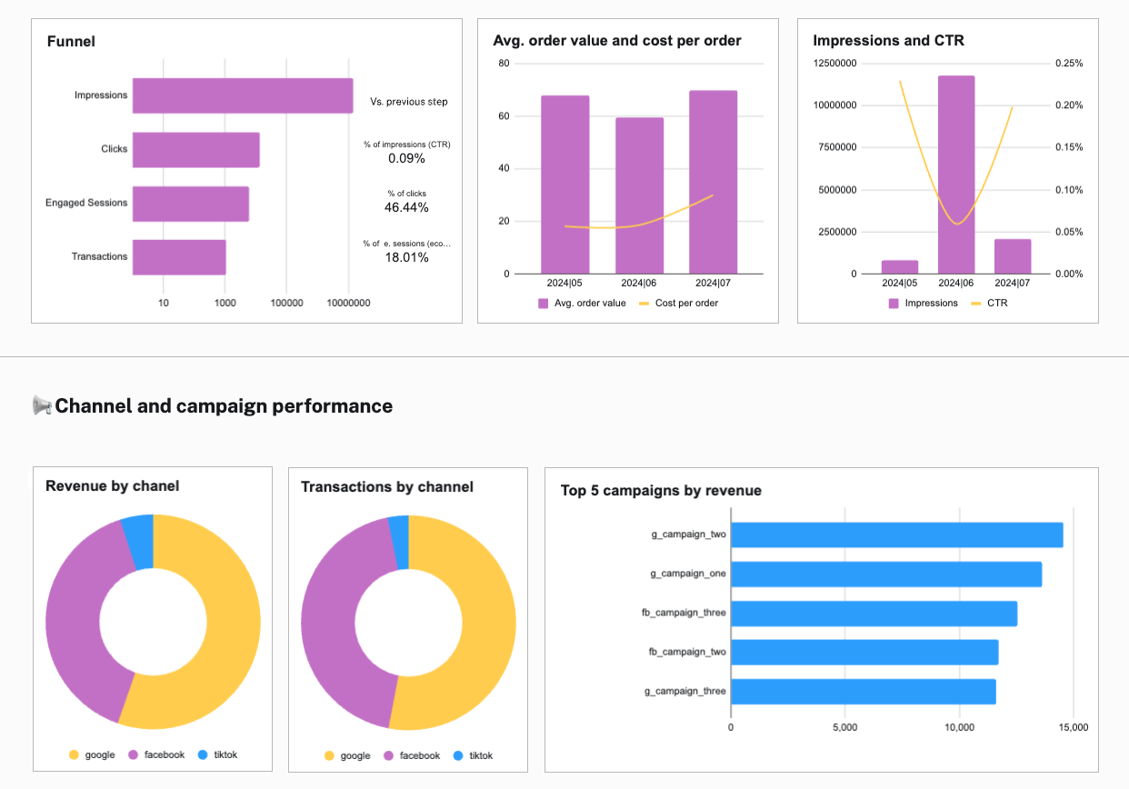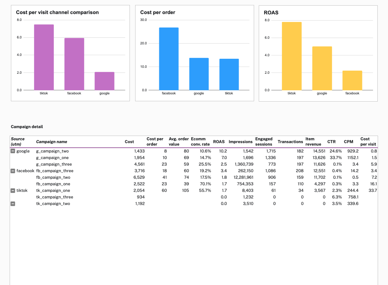 Analyze and optimize your ecommerce ad performance across Google, Facebook, TikTok and Google Analytics 4 using this plug-and-play Google Sheets dashboard — based on last-click attribution.